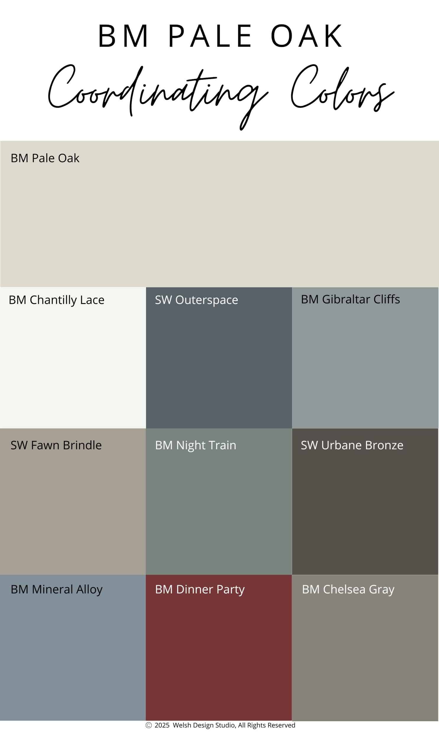 Whether youโre aiming for an all-neutral palette or layering in color, Pale Oak pairs beautifully with muted blues, greens, grays, and whites.