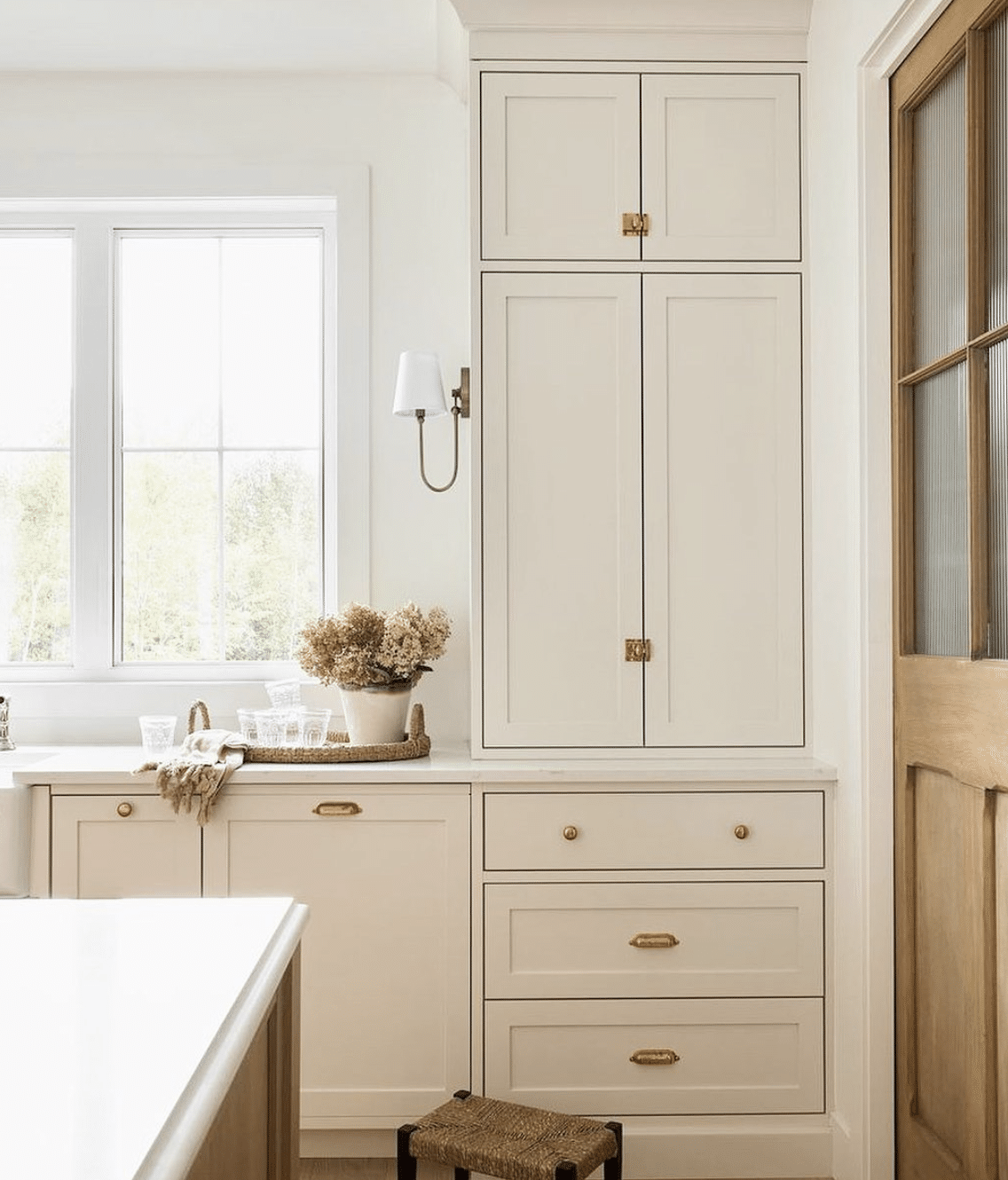 Pale Oak kitchen cabinets or walls will give your kitchen a sophisticated, timeless look. Itโs beautiful with marble or quartz countertops and complements both brass and nickel hardware. Pale Oak is also an ideal wall paint color to go with white cabinets. We paired BM Pale Oak with BM White Dove cabinets in our new kitchen (pic below), and the combo is gorgeous!