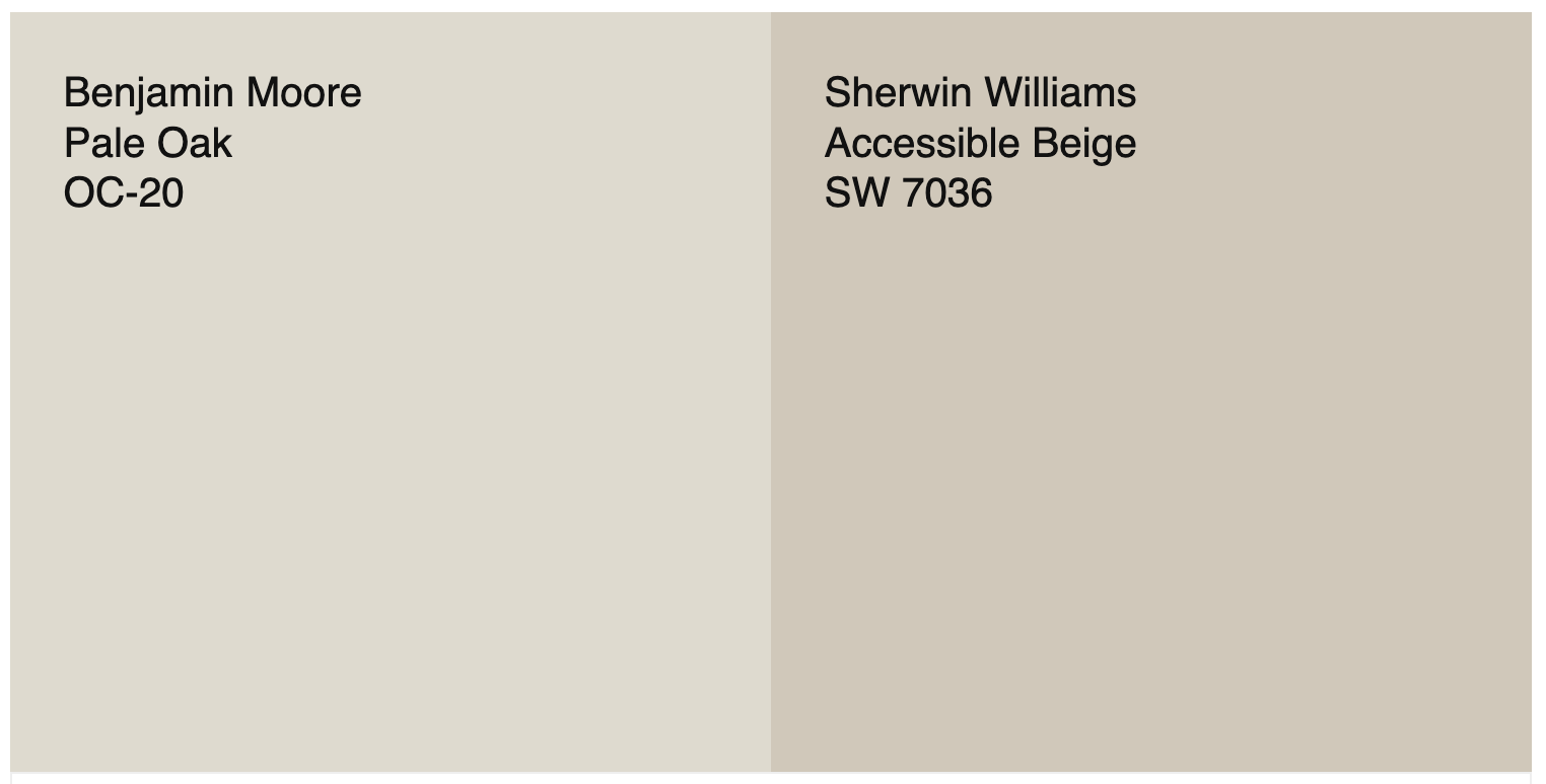 Sherwin-Williams Accessible Beige (SW 7036) is warmer, deeper, and more beige than Pale Oak. If you want a cozier, more traditional feel, Accessible Beige might be your pick. But if you prefer something lighter and more contemporary with a touch of gray sophistication, Pale Oak is the winner. Take a look at my review of Accessible Beige for more info about this gorgeous color.