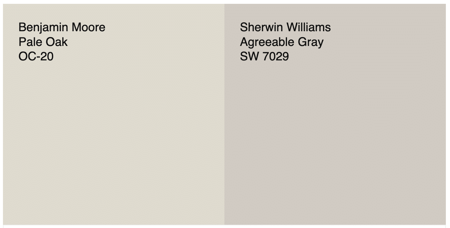 Sherwin-Williams Agreeable Gray (SW 7029) is slightly darker and more gray than Pale Oak, with fewer pink undertones. Agreeable Gray can feel a little cooler, especially in north-facing rooms, while Pale Oak has a warmer, softer appearance. Read my full review of Agreeable Gray for an in-depth look.