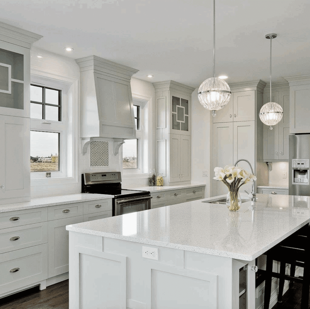 Gray Owl can also be a beautiful kitchen cabinet color choice, giving a soft coastal vibe to your kitchen, as seen in the kitchen below.