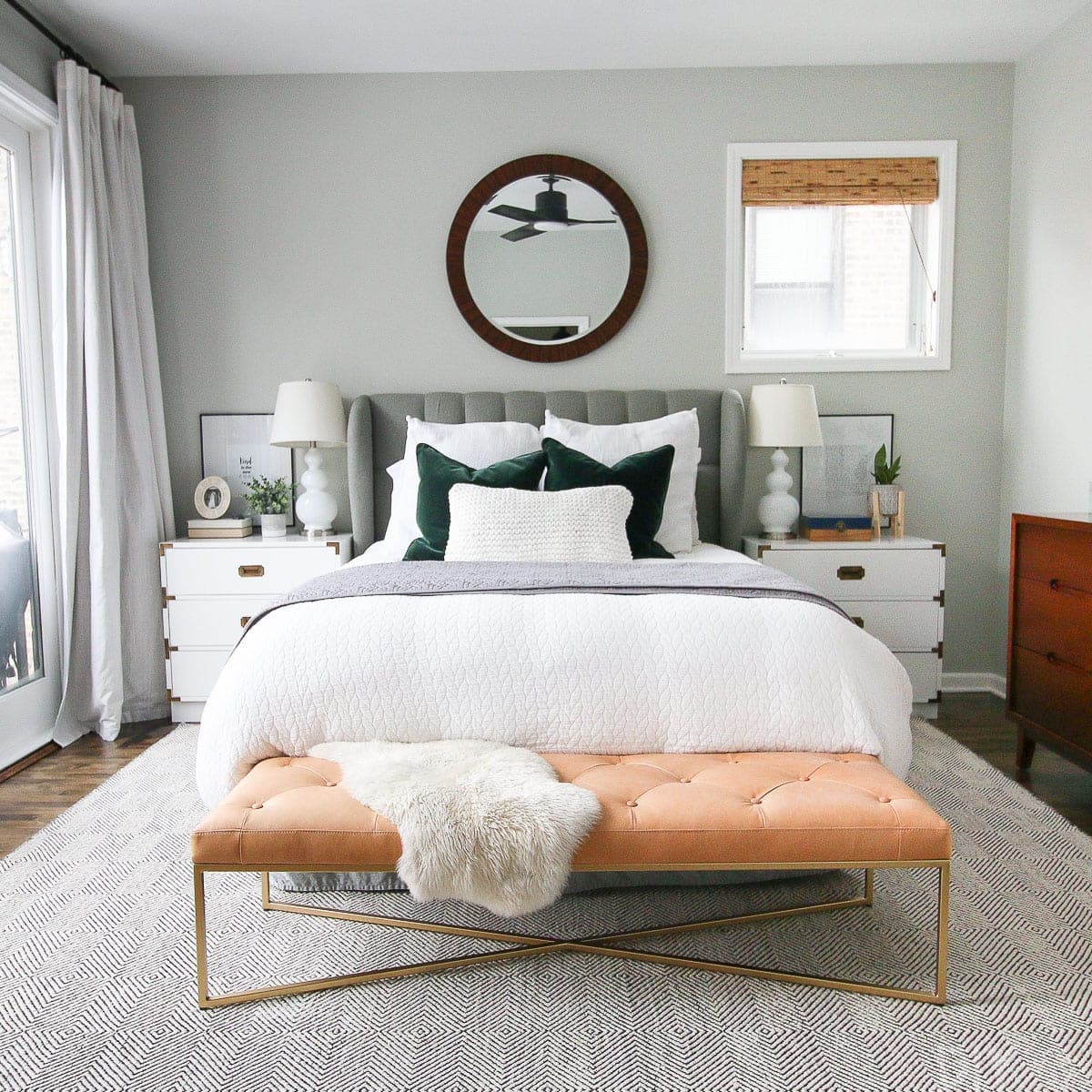 Because Gray Owl has subtle blue and green undertones, it’s going to look especially beautiful with other paint colors that have blue-green, blue-gray, or gray-green undertones. On the other hand, warm grays and greiges will also work with with Gray Owl, but their warm tones will amplify Gray Owl’s blue and green undertones. If you want a fresh look with beautiful results, build your Gray Owl palette with a mix of muted blues and/or greens, and soft whites, and then add warmth with wood tones or brass.