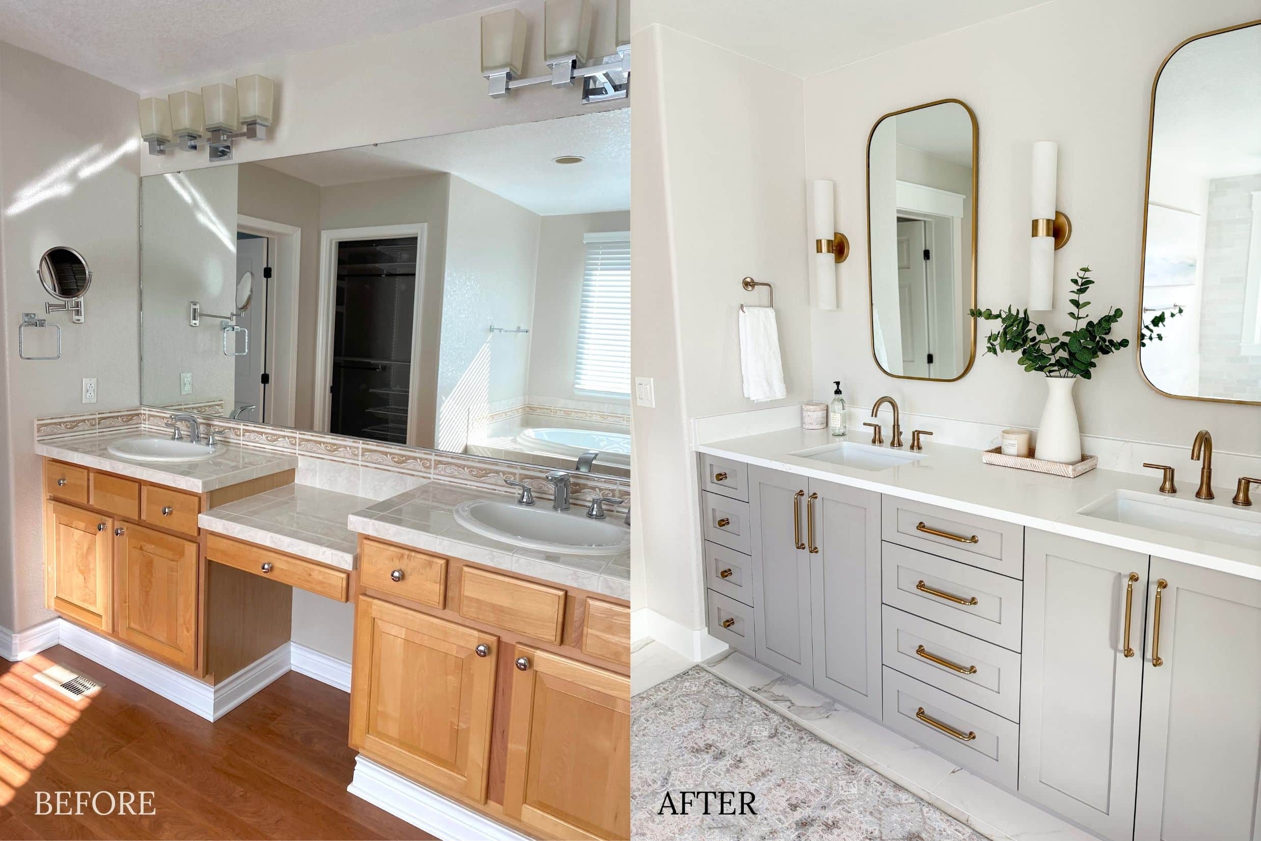 Iโve been so excited to share this bathroom before and after with you! Our primary bathroom renovation has been a huge project in our 2025 remodel, and today Iโm finally revealing the finished space – from the bland, dated โbeforeโ to the light, spa-like new bathroom we get to enjoy every day. This post walks you through our floor plan, tile, countertops, plumbing fixtures, light fixtures, and decor, and Iโll include affiliate links to our exact selections throughout the post.