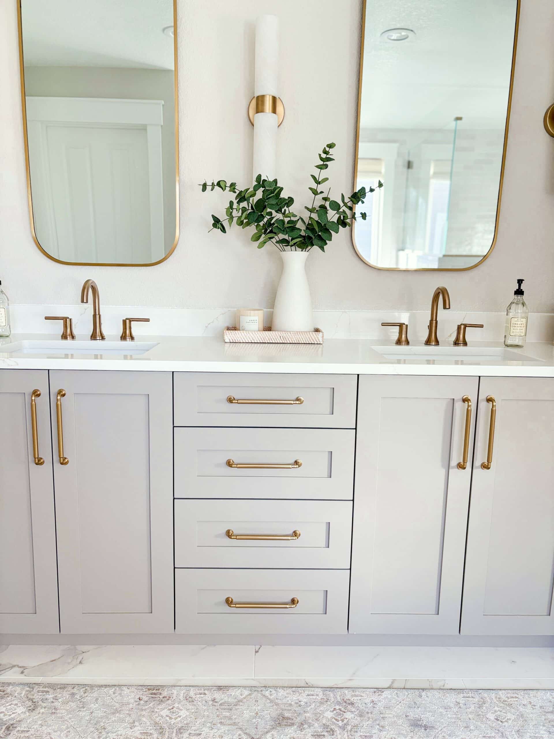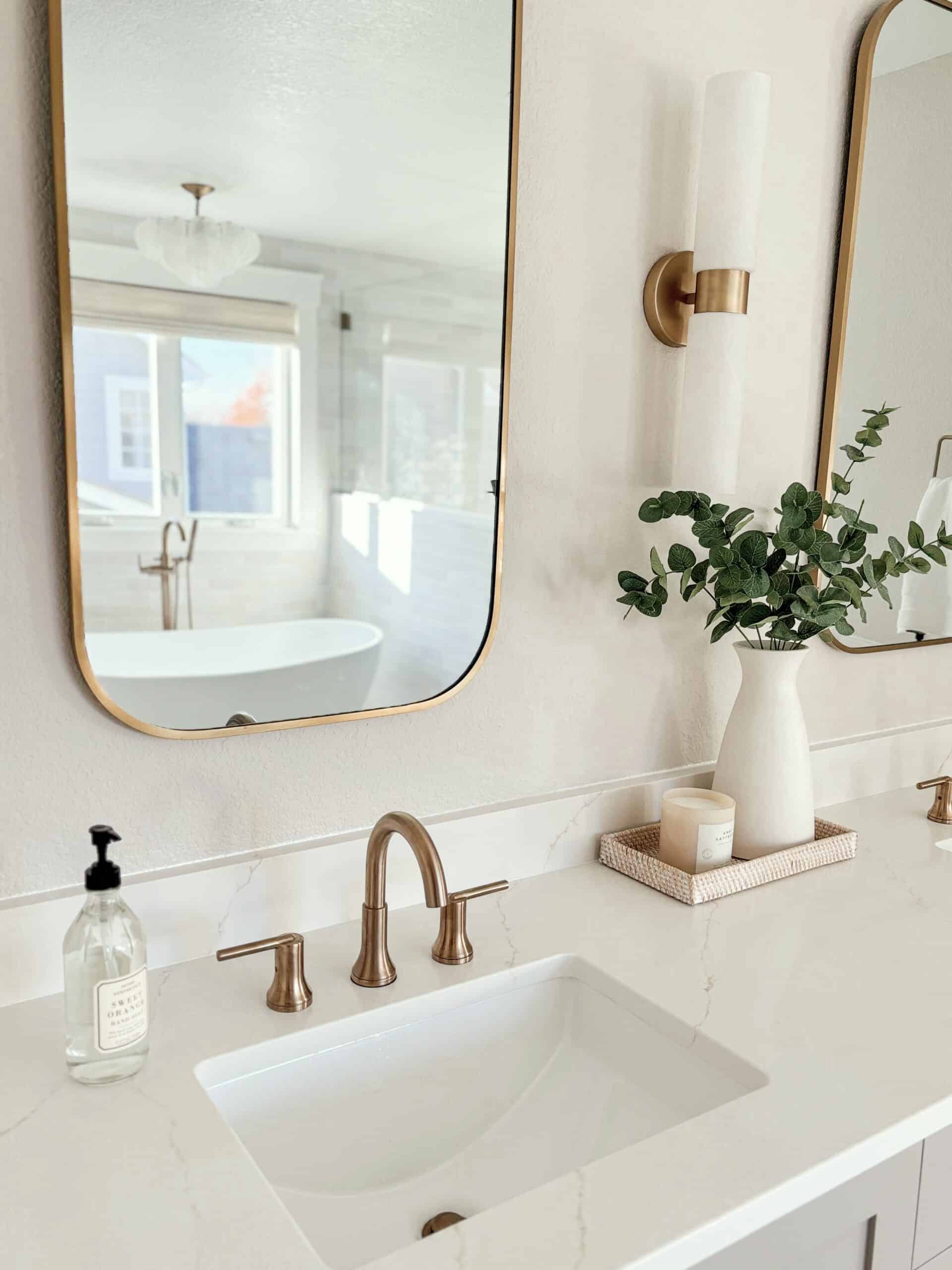 The warm brass on the sconces, cabinet hardware, mirrors, and plumbing fixtures brings in that California Casual/Modern Coastal mix I love! It looks elevated, but not fussy. The brass tones also echo the warm tones in the floor tile veining and quartz countertops, so everything feels intentional and cohesive.