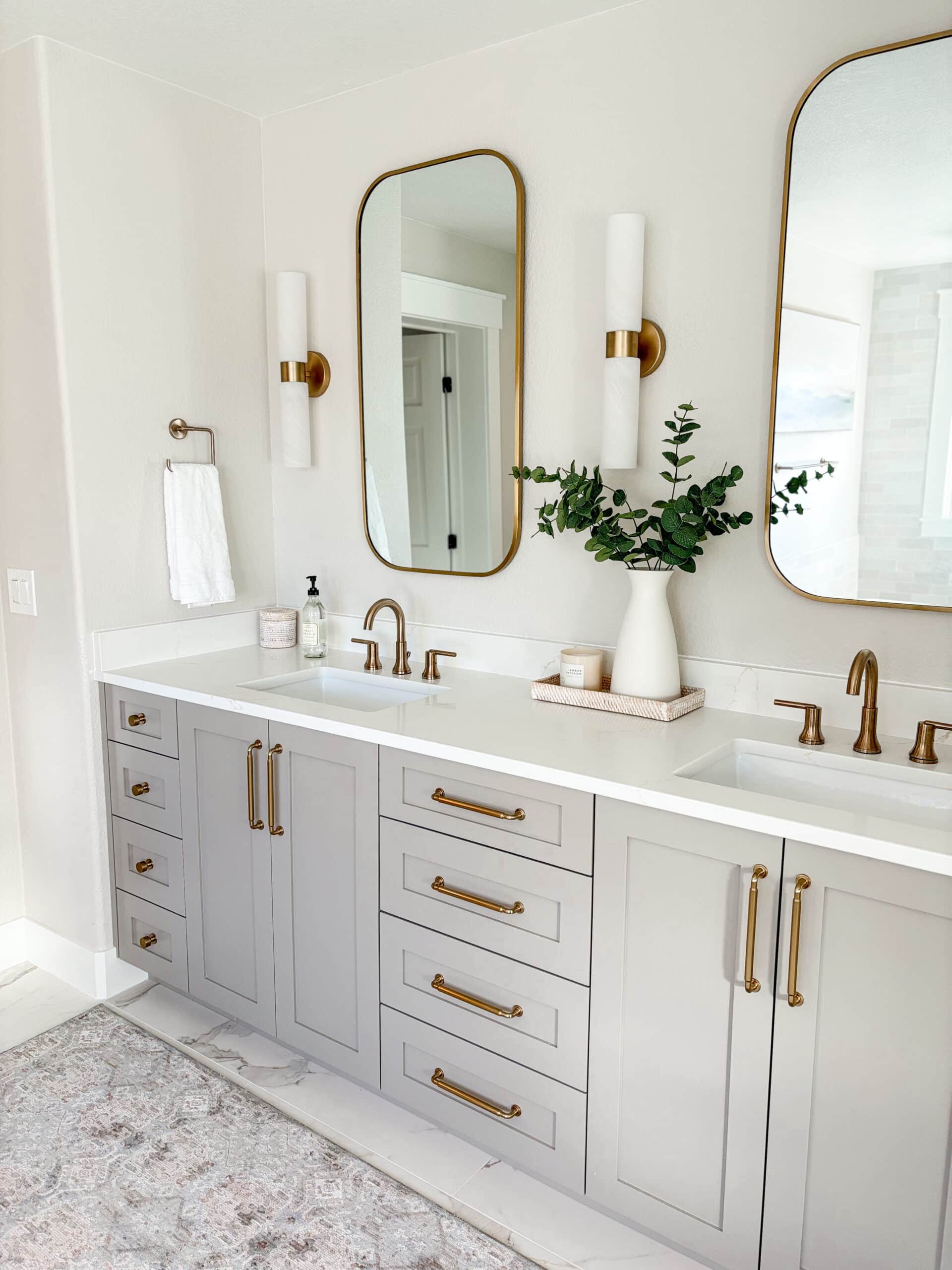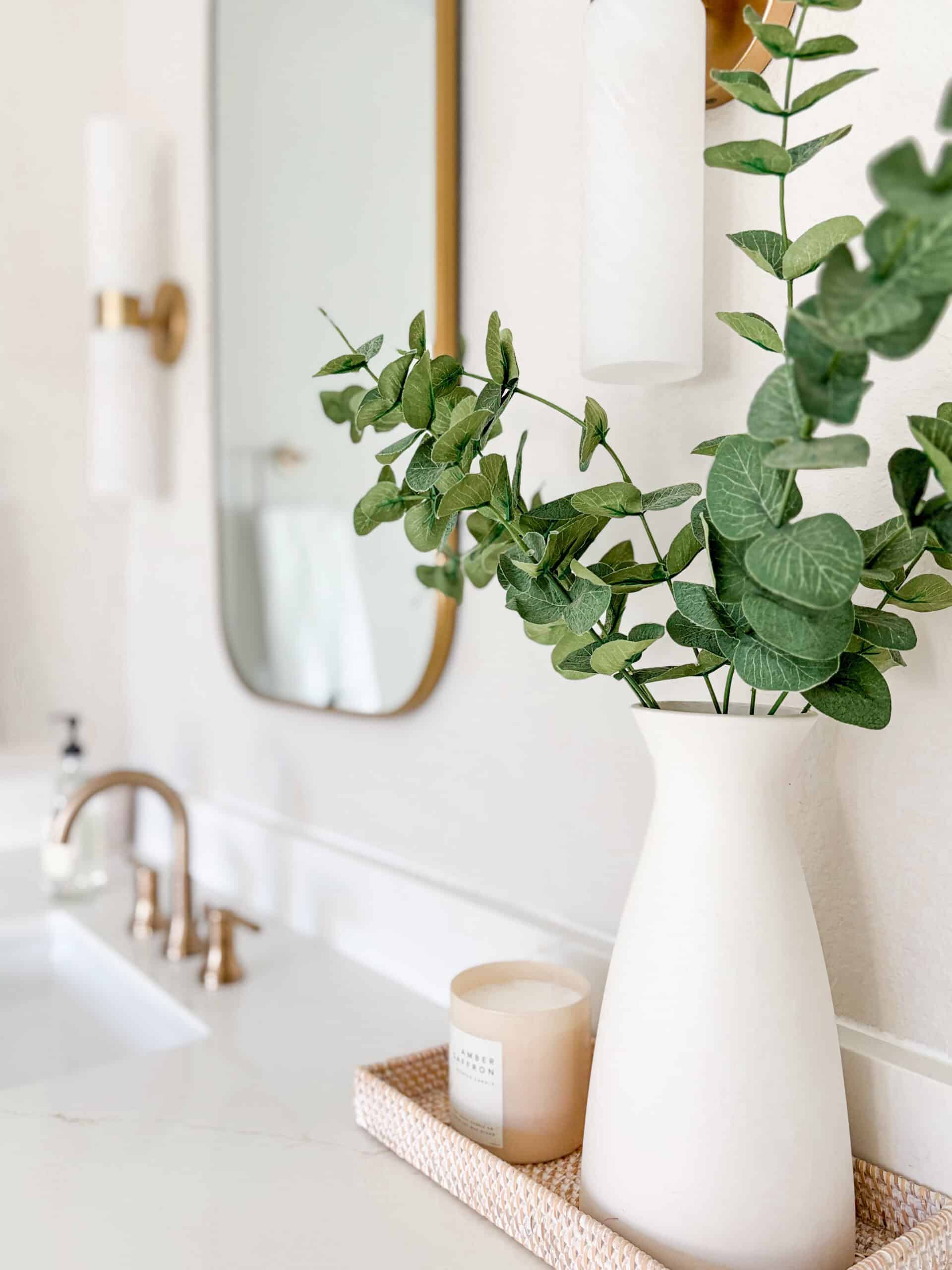 Faucets | Vanity Paint Color | Sinks | Rug | Wall Paint Color | Tava Woven Tray | White Carafe Vase | Eucalyptus Stems
