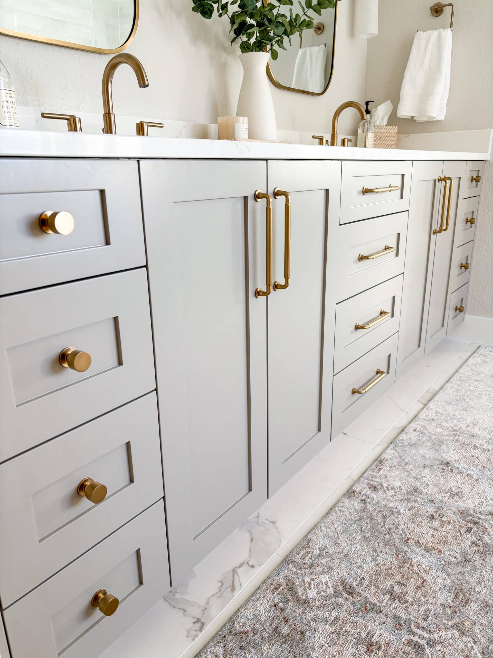 We replaced the old, two-tier vanity with custom, frameless shaker-style cabinets and drawers. Theyโre painted Sherwin-Williams Intellectual Gray, a warm gray with a subtle green undertone that plays so nicely with our floor tile and brass fixtures.
