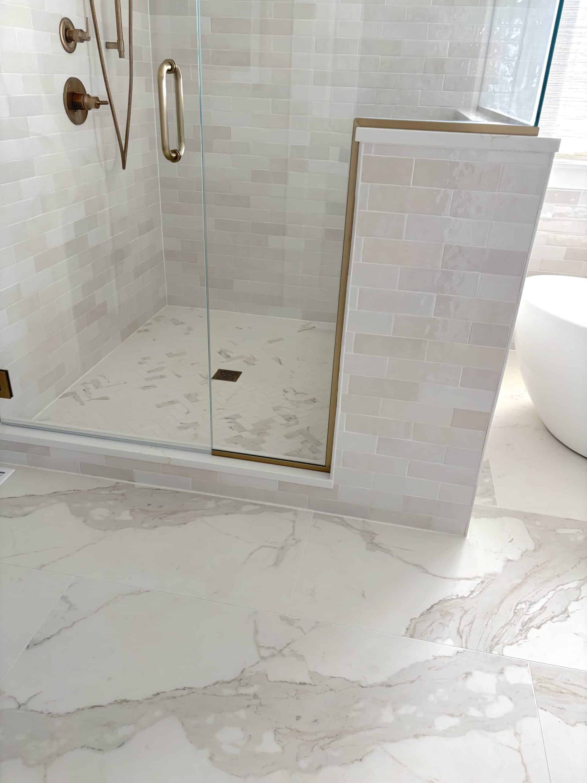 - Bench top, ledge, and curb: MSI Calacatta Miraggio Gold quartz (to match our countertops)