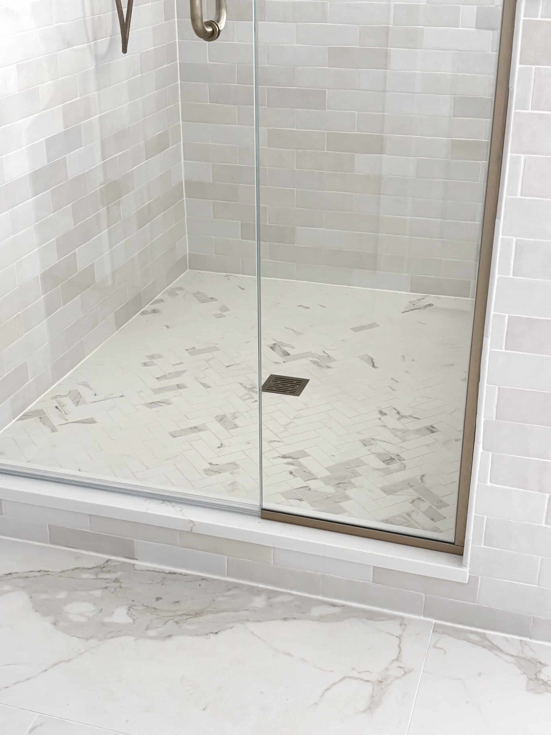 - Shower floor tile: same tile in a smaller 1″ x 4″ herringbone pattern (Magnifica 1″ x 4″ Honed Herringbone Porcelain Mosaic Tile in Calacatta Super White)