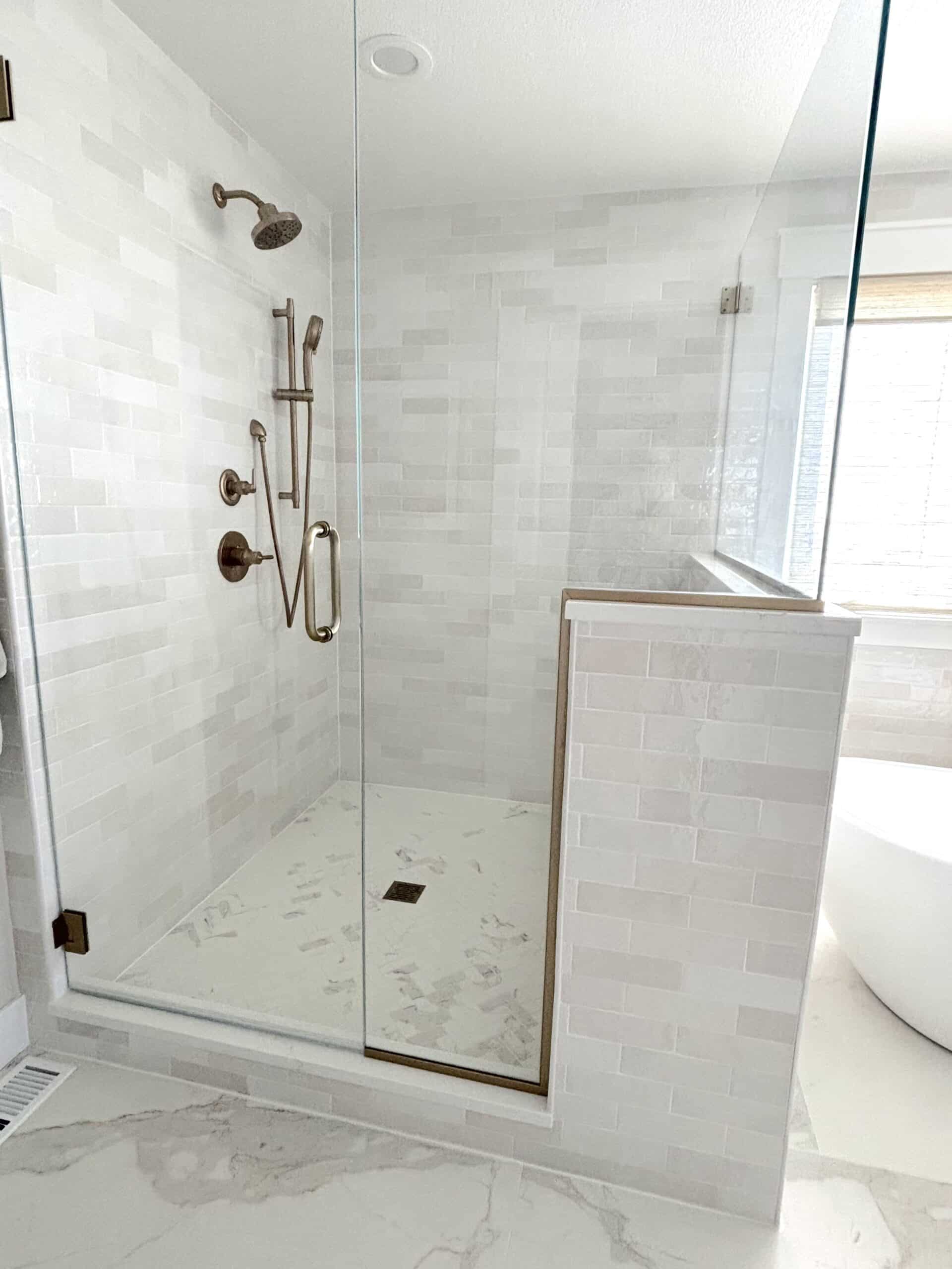 Our new walk-in shower is absolutely one of the best parts of this bathroom renovation. The size is similar to what we had before, but the materials and details make it feel like a completely different space. We also relocated the bench from the side to the back of the shower, which makes it feel more spacious than before.