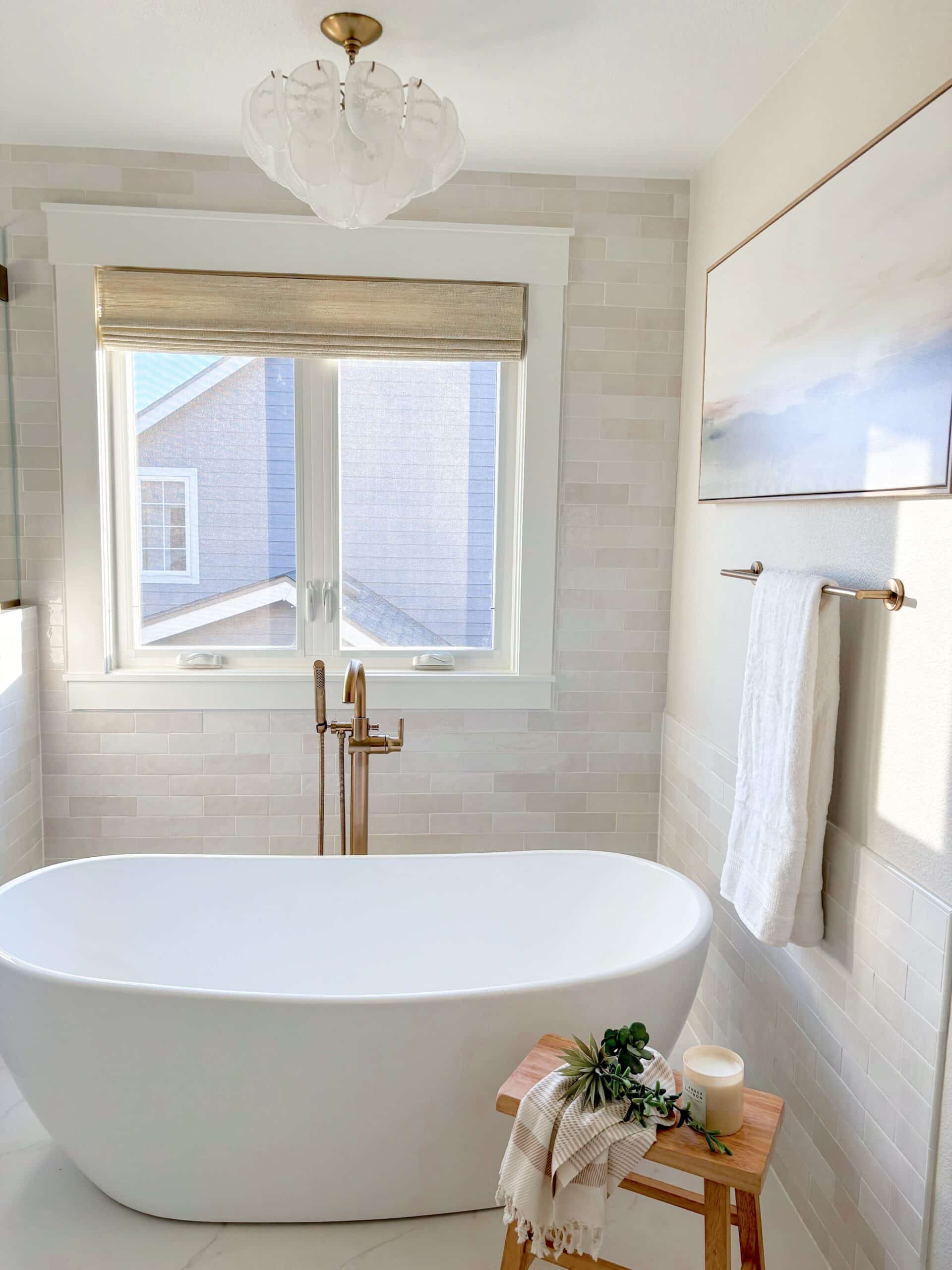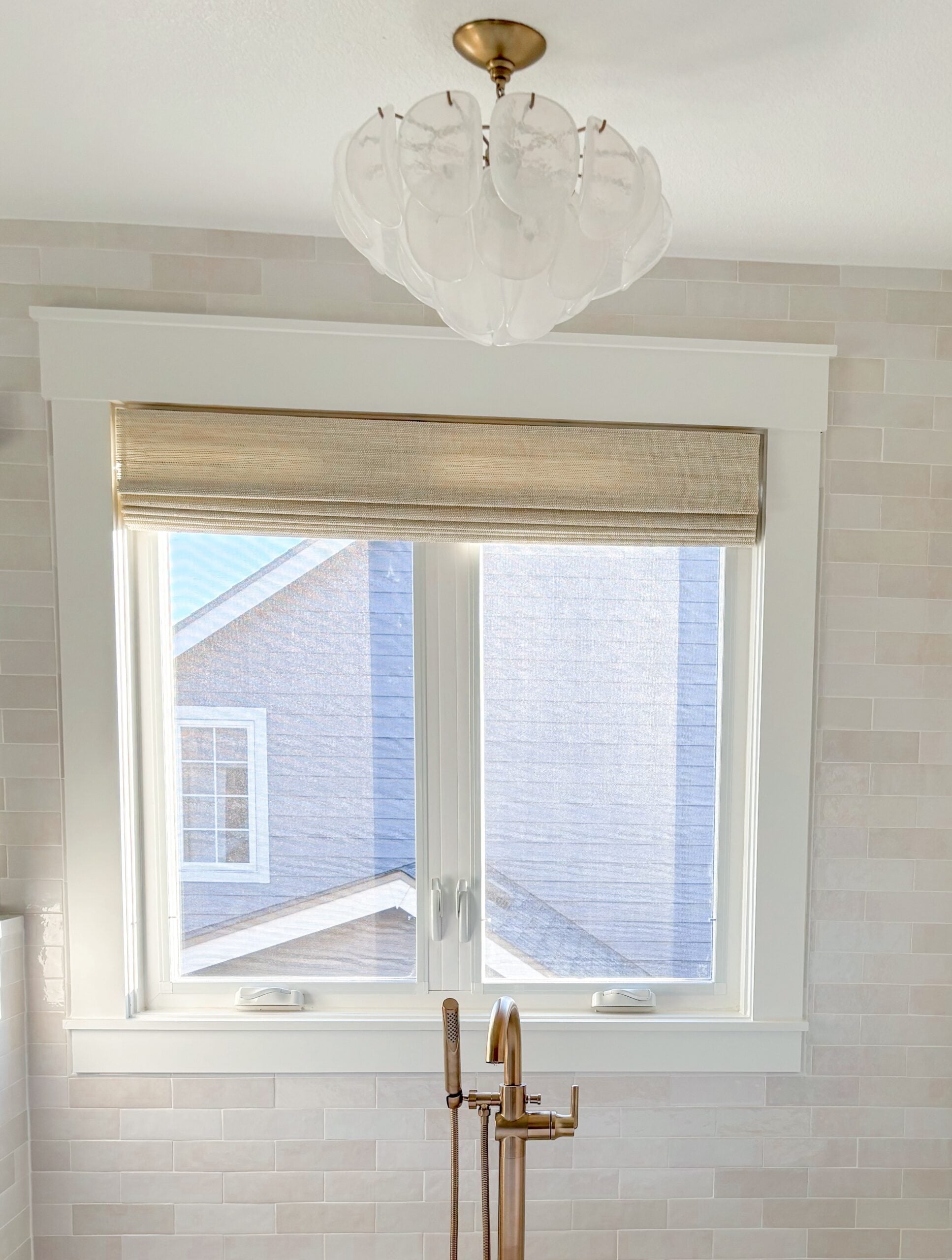 This space was a huge opportunity for some wow factor! We took the shower wall tile and added it all the way to the ceiling in the tub area, as well. Then, we added a gorgeous glass light fixture above the tub. We also installed some beautiful lined bamboo roman shades in the window to reflect our modern coastal style, and highlight the beautiful window trim.