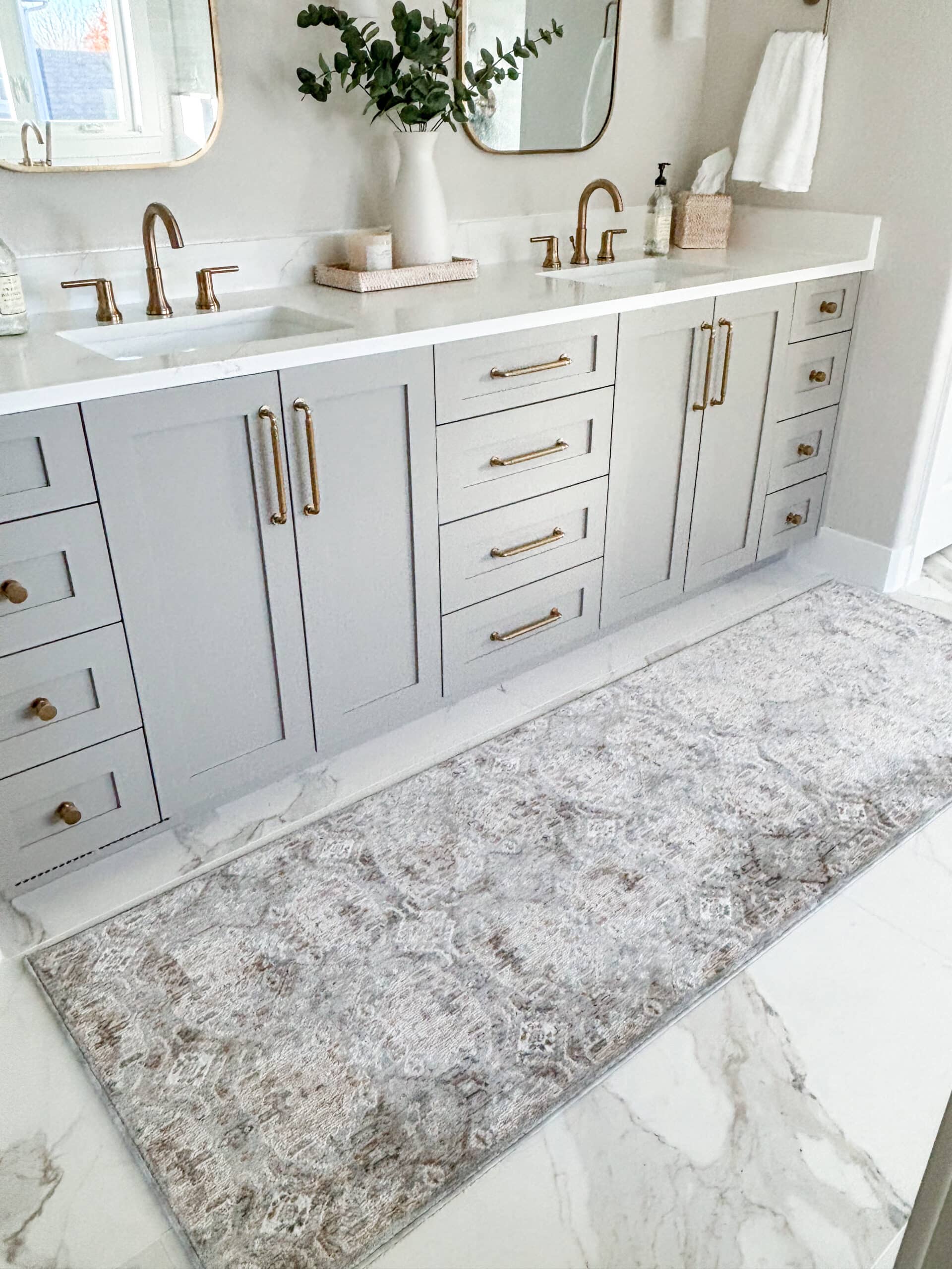 The runner rug (Amber Lewis x Loloi Zuma Silver Runner) perfectly ties all of the colors in the bathroom together, while adding some pattern and personality.