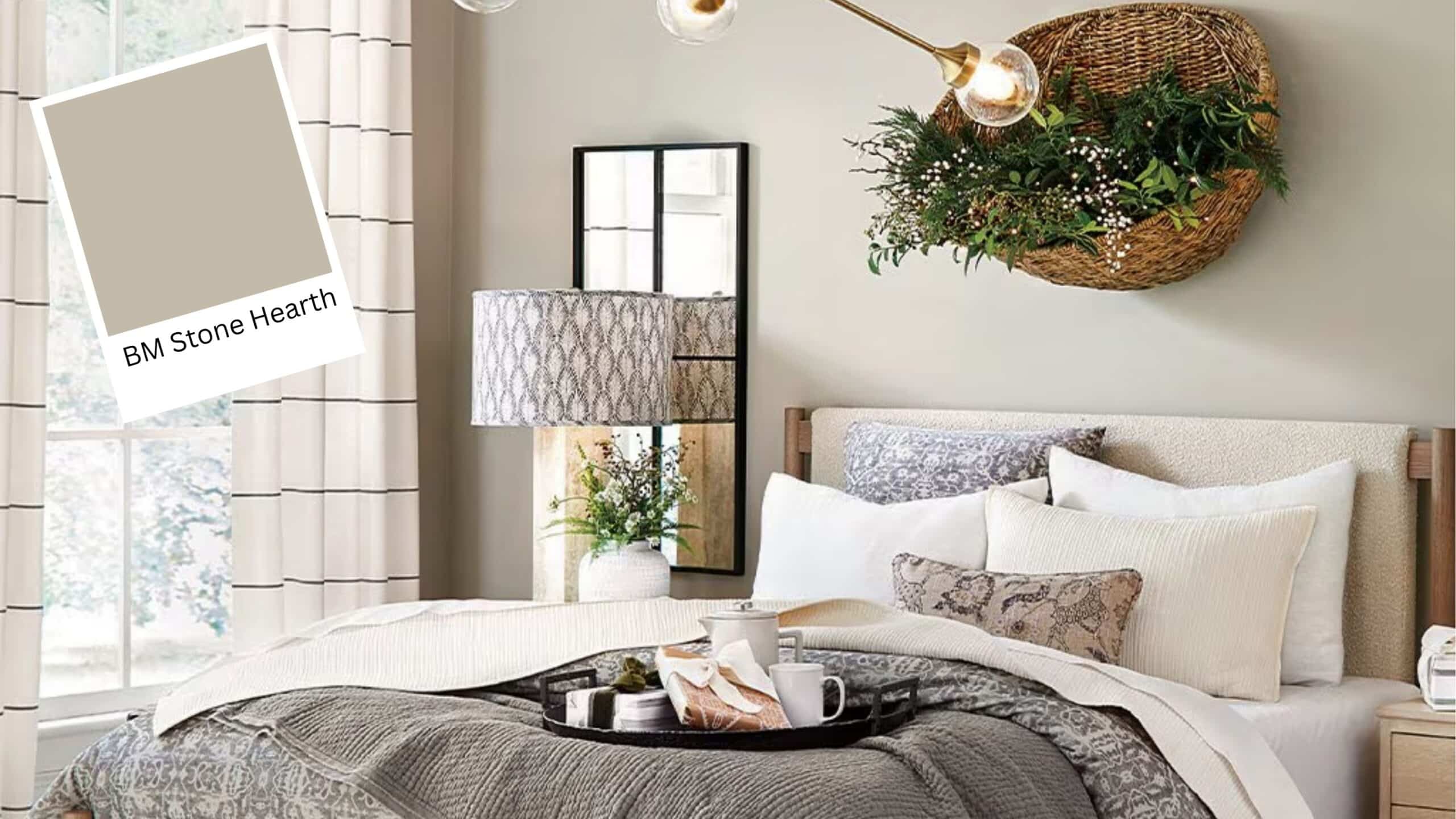 Benjamin Moore’s Stone Hearth is a sophisticated, warm greige with brown and taupe undertones. This popular shade adds instant coziness and elegance to a bedroom and works especially well with darker wood tones and soft, creamy whites. Use this beautiful neutral color in modern farmhouse or transitional bedrooms with an upholstered headboard and lots of cozy textiles.