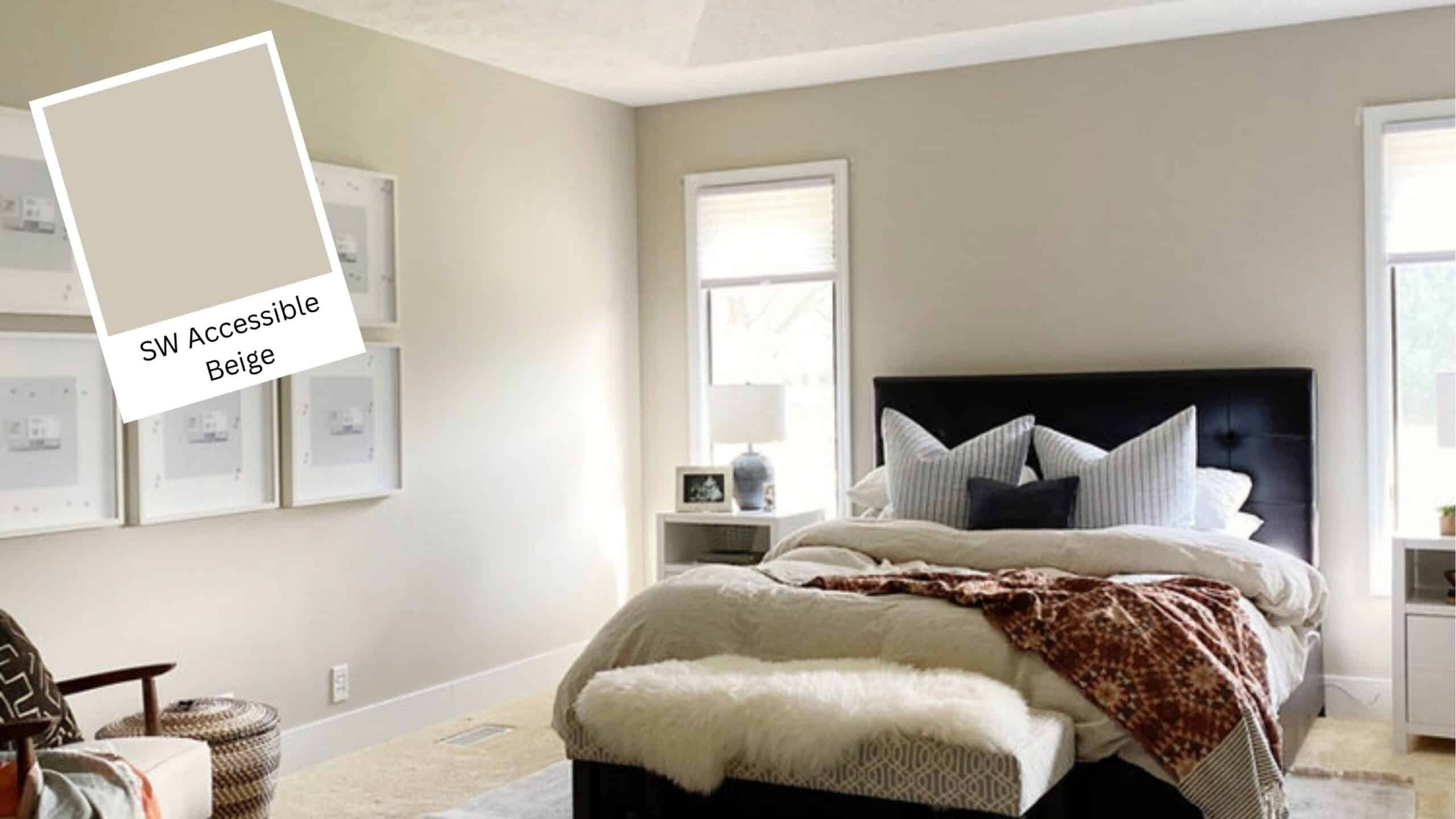 Accessible Beige by Sherwin-Williams is a lovely, versatile warm greige. The great thing about its gray undertones is they keep it from looking too golden beige or dated. Accessible Beige a go-to neutral for bedrooms because it creates a relaxed, neutral backdrop that works with any style, lots of different patterned bedding, and a wide range of natural materials. This is great color to use in your color scheme because it works beautifully in artificial lighting and balances with both warm colors and cool tones. Read my full review of SW Accessible Beige for more insights.