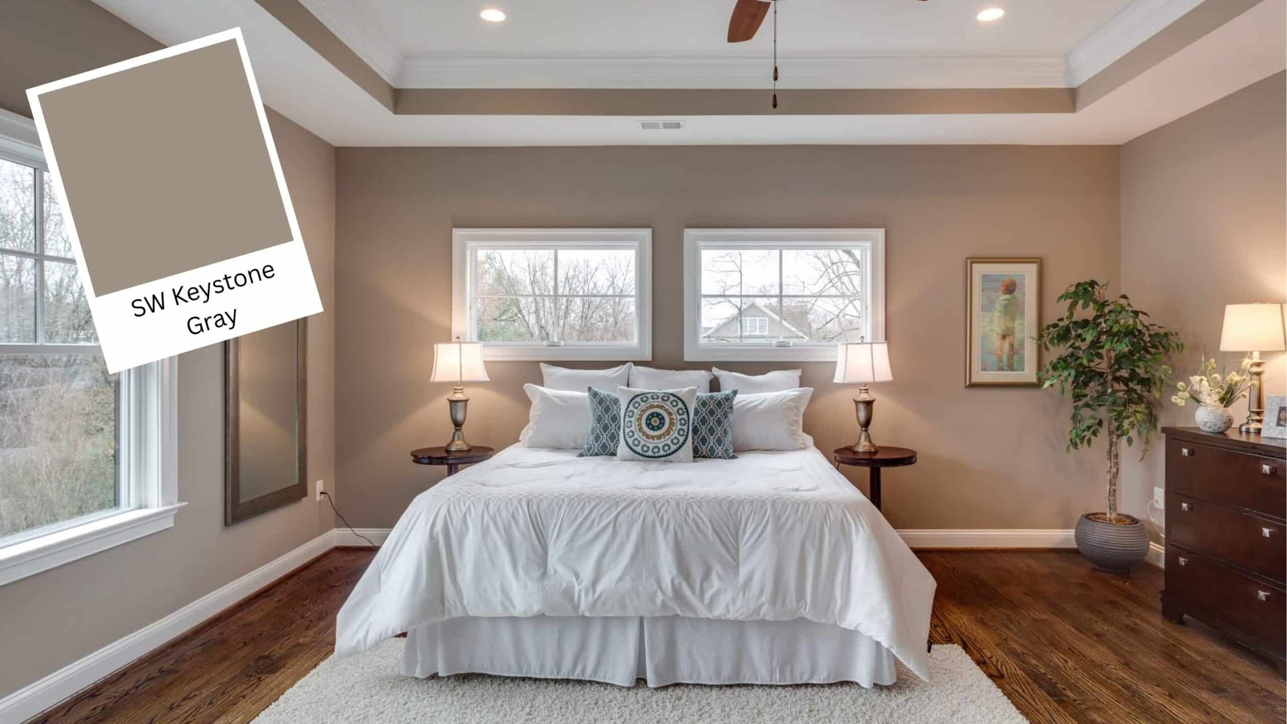 Keystone Gray from Sherwin-Williams is a mid-tone warm gray with taupe undertones. Itโs grounded and timeless, making it a great bedroom choice for creating a relaxed, comfortable feel. Keystone Gray works great in both rustic and modern spaces with layered textures and darker shades of wood. It has a nicely balanced warmth to it that makes it versatile across many different color schemes.